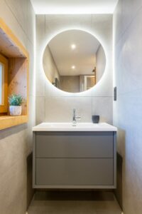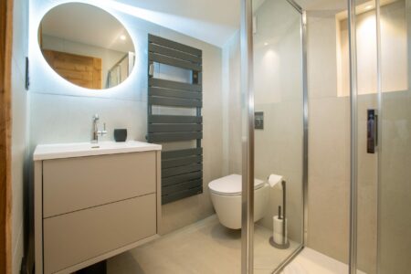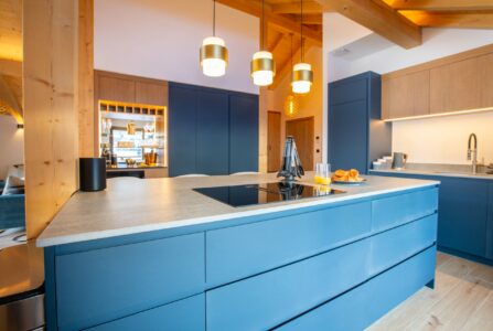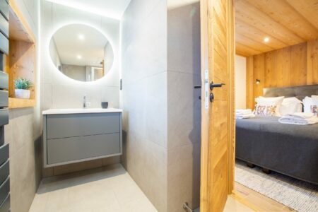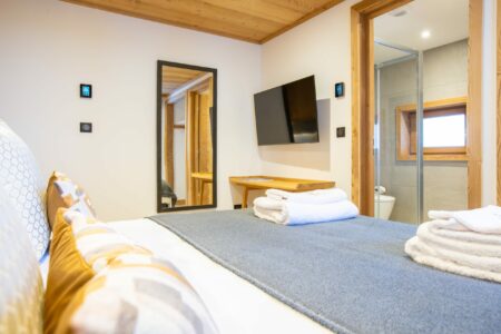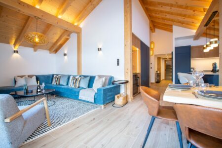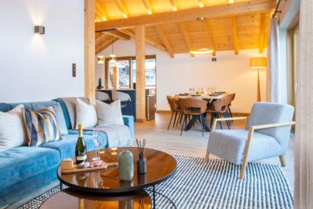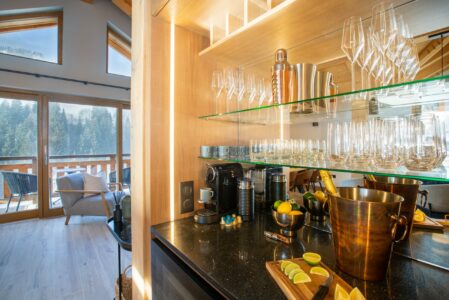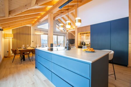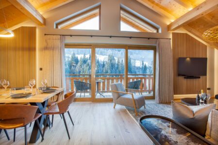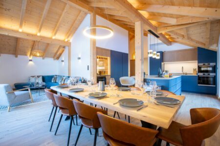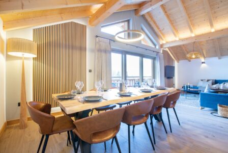 Laid out over two floors, Chalet Peter Pan welcomes guests with a spacious, light-filled open-plan kitchen, dining, and lounge area. The contemporary kitchen, adorned with sleek countertops and state-of-the-art appliances, is a chef’s delight and serves as a central hub for social interaction. This inviting space is perfect for gathering and sharing stories of the day’s adventures while meals are being prepared. The adjoining dining area exudes elegance, offering ample room for delightful meals and memorable gatherings. The lounge area, featuring a plush L-shaped sofa, flat-screen TV, and breathtaking views of the Pleney slope, is the ultimate spot for relaxation. The seamless transition between the kitchen, dining, and lounge areas creates a welcoming atmosphere for unwinding or entertaining.
