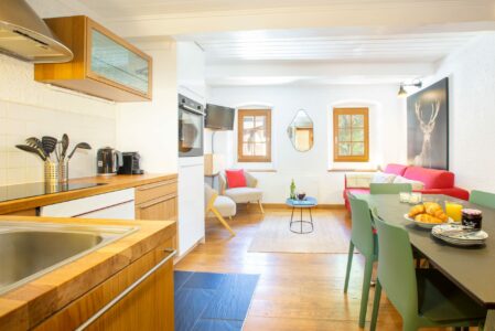 Inside, the apartment offers a warm and practical layout. The lounge features a smart TV, sofa, and two armchairs, providing a comfortable space to relax after a day outdoors. The oak kitchen is fully equipped with a dishwasher, oven, hob, fridge, and coffee machine, while the dining table seats up to six, perfect for shared meals and planning the next day’s adventures.