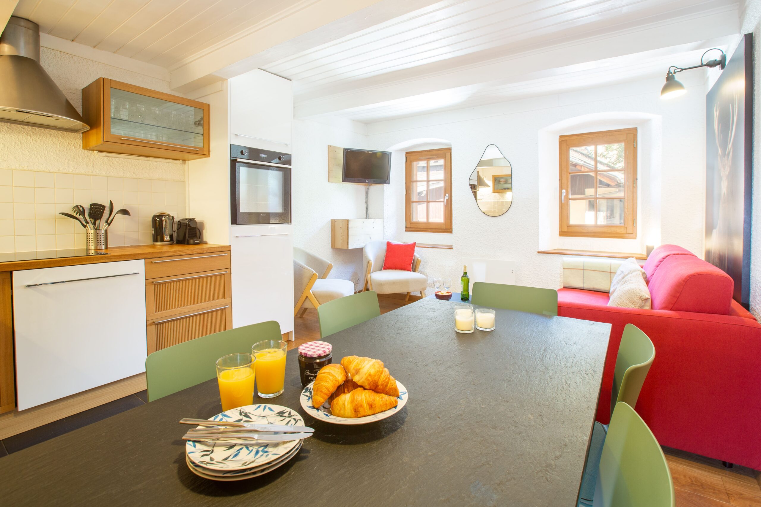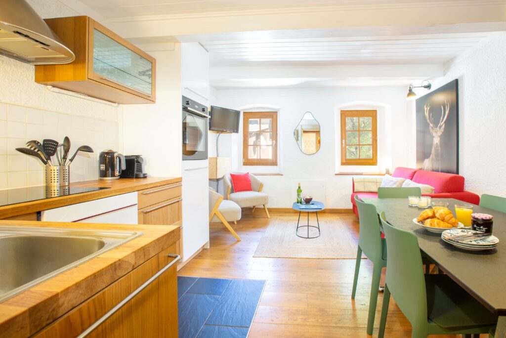 Inside, the apartment offers a warm and practical layout. The lounge features a smart TV, sofa, and two armchairs, providing a comfortable space to relax after a day outdoors. The oak kitchen is fully equipped with a dishwasher, oven, hob, fridge, and coffee machine, while the dining table seats up to six, perfect for shared meals and planning the next day’s adventures.