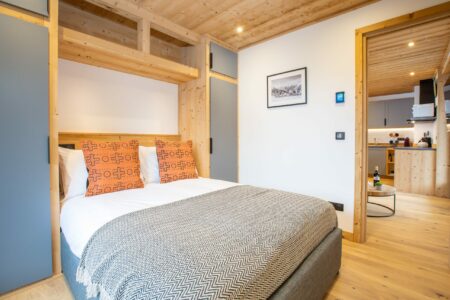 The main bedroom is just off the lounge and features a queen-size bed, offering a peaceful retreat. It also has access to its own private balcony, where you can enjoy the stunning mountain views down the valley. The apartment also boasts a second balcony off the lounge, providing even more opportunities to take in the breathtaking Alpine landscape.