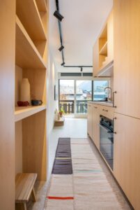 The open-plan living area is bright and welcoming, featuring a smart TV, Bluetooth speaker, and a comfortable dining space with seating for five. The clever layout includes a fixed double bed that enhances the apartment’s Scandinavian aesthetic while providing a stylish and functional sleeping area. The sleek kitchen is fully equipped for a self-catered stay, with a coffee machine, dishwasher, oven, fridge, freezer, and hob — everything you need to prepare relaxed meals at home. The dining area enjoys beautiful mountain views, while the private balcony is perfect for morning coffee or evening drinks after a day on the slopes. The separate bedroom includes bunk beds, ideal for children or friends sharing. A modern family bathroom features a shower and heated towel rail, and an in-unit washer-dryer with ironing facilities ensures complete convenience during longer stays.