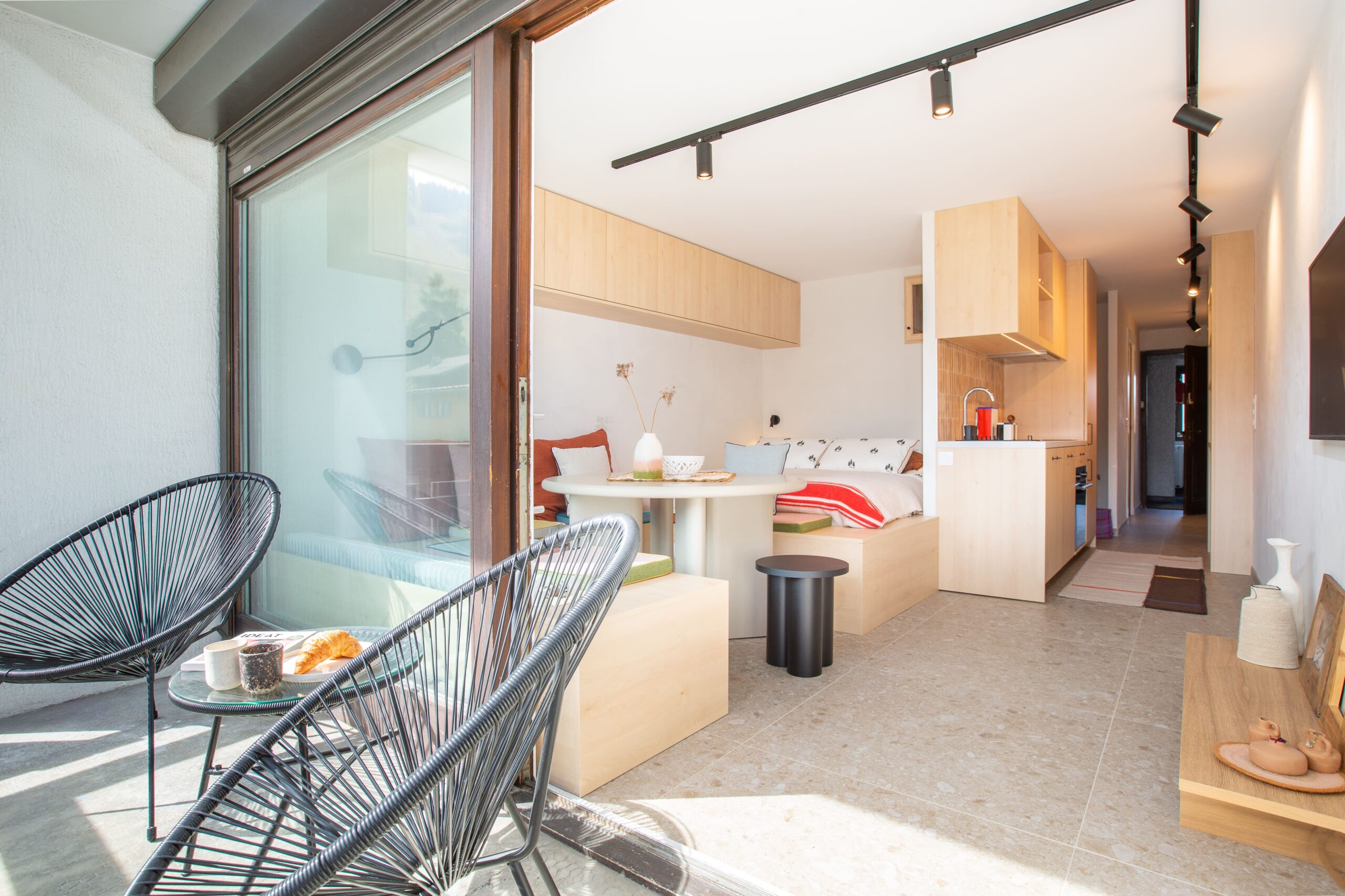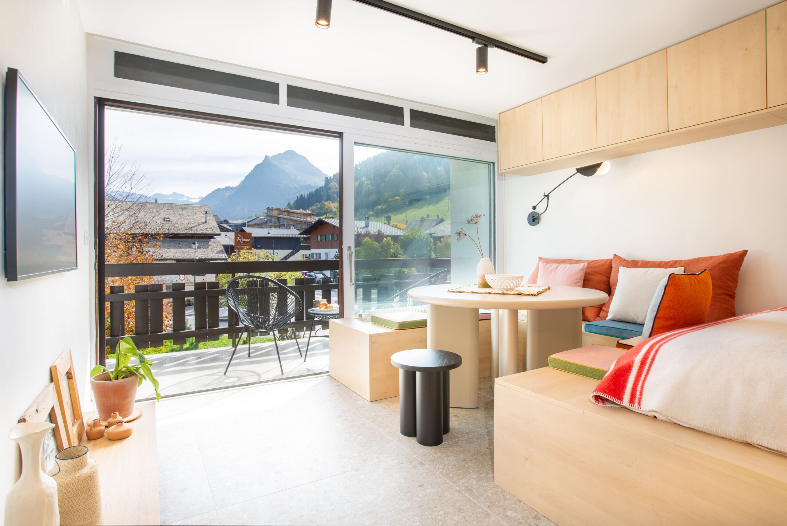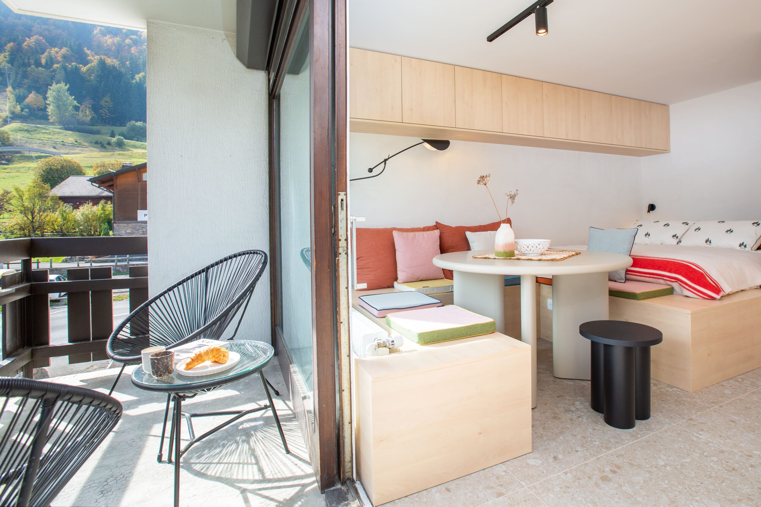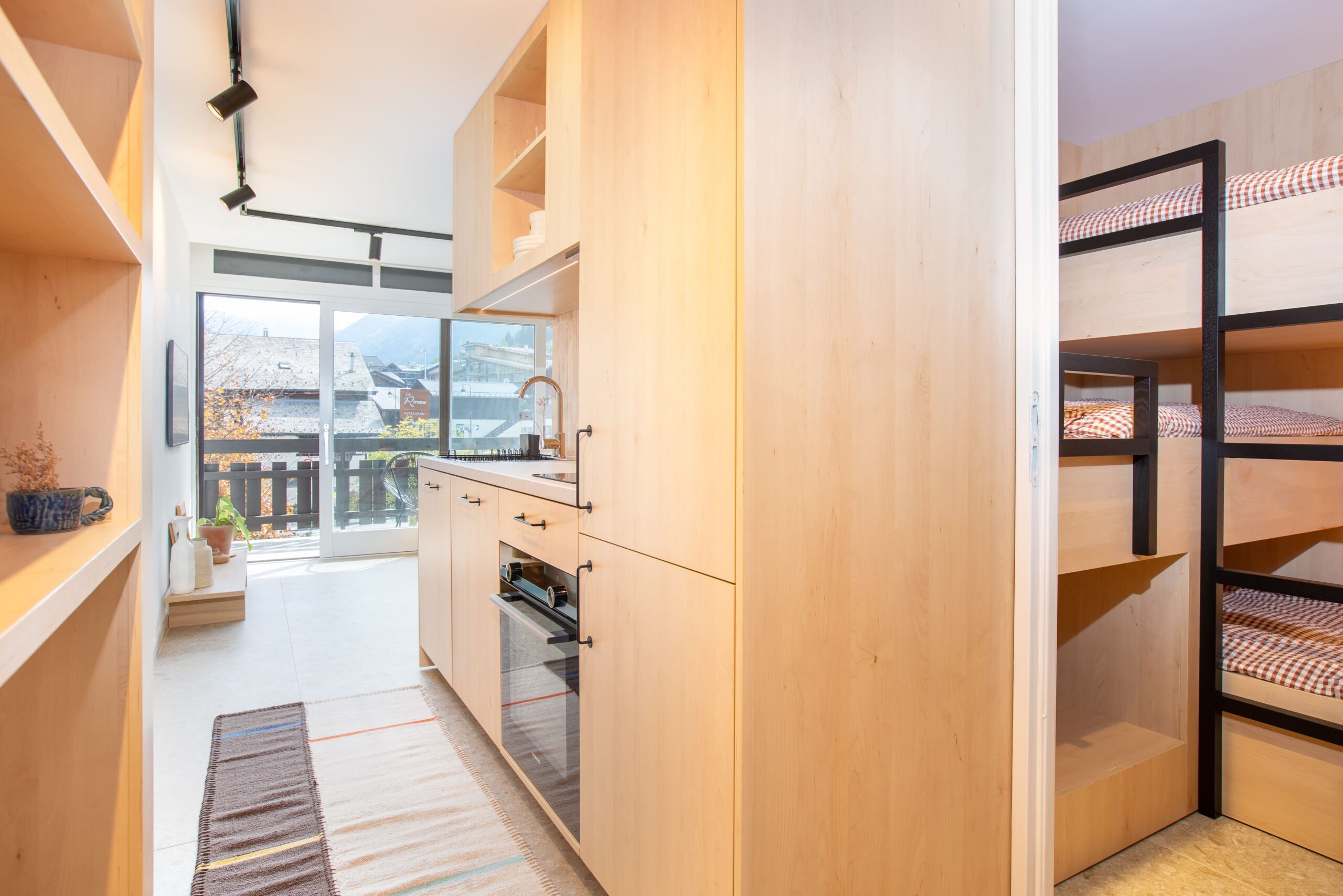 The open-plan living area is bright and welcoming, featuring a smart TV, Bluetooth speaker, and a comfortable dining space with seating for five. The clever layout includes a fixed double bed that enhances the apartment’s Scandinavian aesthetic while providing a stylish and functional sleeping area. The sleek kitchen is fully equipped for a self-catered stay, with a coffee machine, dishwasher, oven, fridge, freezer, and hob — everything you need to prepare relaxed meals at home. The dining area enjoys beautiful mountain views, while the private balcony is perfect for morning coffee or evening drinks after a day on the slopes. The separate bedroom includes bunk beds, ideal for children or friends sharing. A modern family bathroom features a shower and heated towel rail, and an in-unit washer-dryer with ironing facilities ensures complete convenience during longer stays.