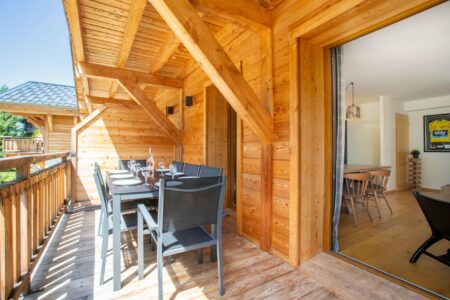Set across two levels, the apartment comfortably sleeps up to six guests. Upstairs, the spacious open-plan lounge, kitchen and dining area is warm and welcoming, complete with underfloor heating, a flat-screen smart TV, and a large dining table for shared meals. Sliding doors open onto a generous balcony with outdoor seating and dining space, offering stunning views over the picturesque valley – ideal for relaxing with a morning coffee or après drink.
