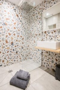 The apartment offers a sleek modern bathroom with a walk-in shower and heated towel rail, complemented by a separate toilet for added convenience. Additional amenities include underfloor heating throughout and a separate laundry cupboard with a washer-dryer.